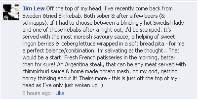 eDreams: Jim, to go back to the good food (hungry already!), you were saying it would be difficult for you to pick between an Elk Kebab and a “blindigly hot Swedish lady” if you had to.